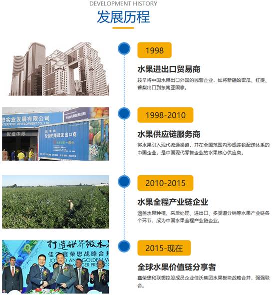 鑫荣懋深化全球供应链布局,形成了国内外优质水果稳定的供应链。在全球主要水果产区泰国、越南、菲律宾、智利、秘鲁、新西兰、澳大利亚、南非等40多个国家和地区开展水果业务,通过定植、收购、合作、参股等方式链接国内50多个水果种植基地。积极响应“一带一路”倡议,除了在亚太地区深化布局,也在中亚、地中海、欧洲地区加大采购和投资布局。