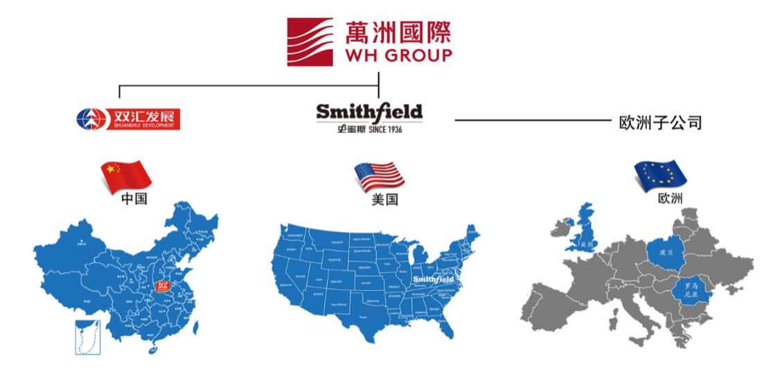 双汇母公司:万洲国际(原双汇国际),总部在香港。拥有2个上市公司,“双汇发展”(000895)深圳上市,“万洲国际”(00288)香港上市。2016年,万洲国际进入《财富》世界500强。