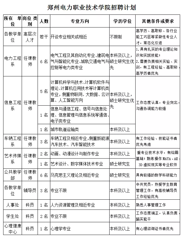 请将个人材料发送至邮箱[email protected]。邮件标题统一格式:“应聘部门+应聘岗位+最高学历+毕业学校+所学专业+姓名+手机号码”,如:“电力工程系-任课教师-硕士研究生-郑州大学-电气工程-张三-139***”。个人简历、各个学习阶段毕业证、学位证、职称证、职业资格证、其他技能证书及相关材料扫描件,请以附件形式打包发送。
