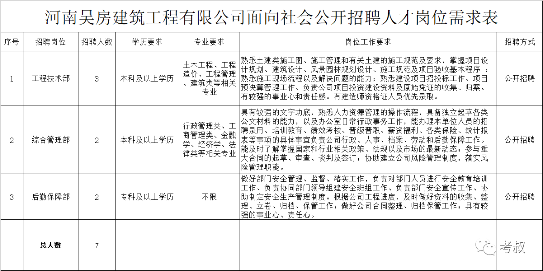 招聘人才7人,其中:工程技术部3人、综合管理部2人、后勤保障部2人。