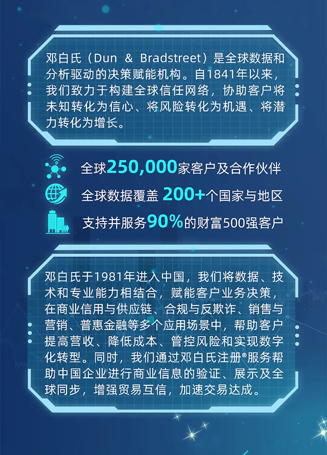 邓白氏于1981年进入中国,我们将数据、技术和专业能力相结合,赋能客户业务决策,在商业信用与供应链、合规与反欺诈、销售与营销、普惠金融等多个应用场景中,帮助客户提高营收、降低成本、管控风险和实现数字化转型。同时,我们通过邓白氏注册®服务帮助中国企业进行商业信息的验证、展示及全球同步,增强贸易互信,加速交易达成。