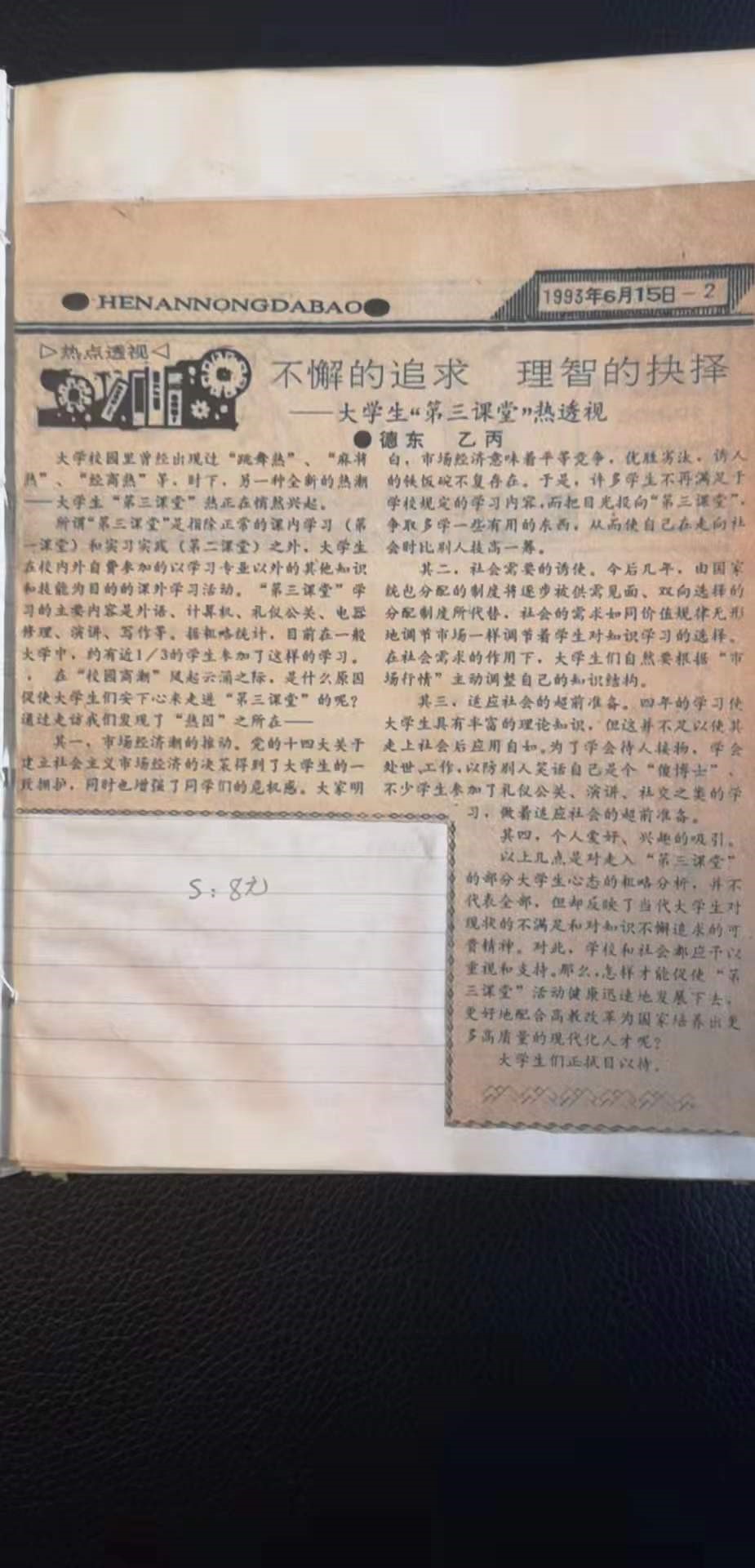 进入大学后,一部分学生思想松懈了,不好好学习,甚至谈起了恋爱(当时大学生谈恋爱是不提倡的),他又开会教育我们“一寸光阴一寸金”,“书中自有颜如玉”,把大好的学习时光浪费了实在可惜,只要你学习努力事业有成,将来一定会收获美好的爱情,上学期间谈对象毕业后难免会劳燕分飞各奔西东。大部分谈恋爱的同学深受启发,一时间学习气氛空前浓厚。他又引导我们说,文字基础对管理人才非常重要,“能写会说”是领导干部的基本功,指导成立了黄河文学社,为《河南农大报》培养了一批学生记者。从此,钻研专业、苦练写作在经贸学院蔚然成风。受杨老师影响,我也爱上了写作,课余时间苦练不辍,竟然也在中央、省、市各级报刊杂志上发表了几篇文章,其中参加人民日报“大学生寒暑假见闻征文活动”的两篇习作得以发表并获奖。