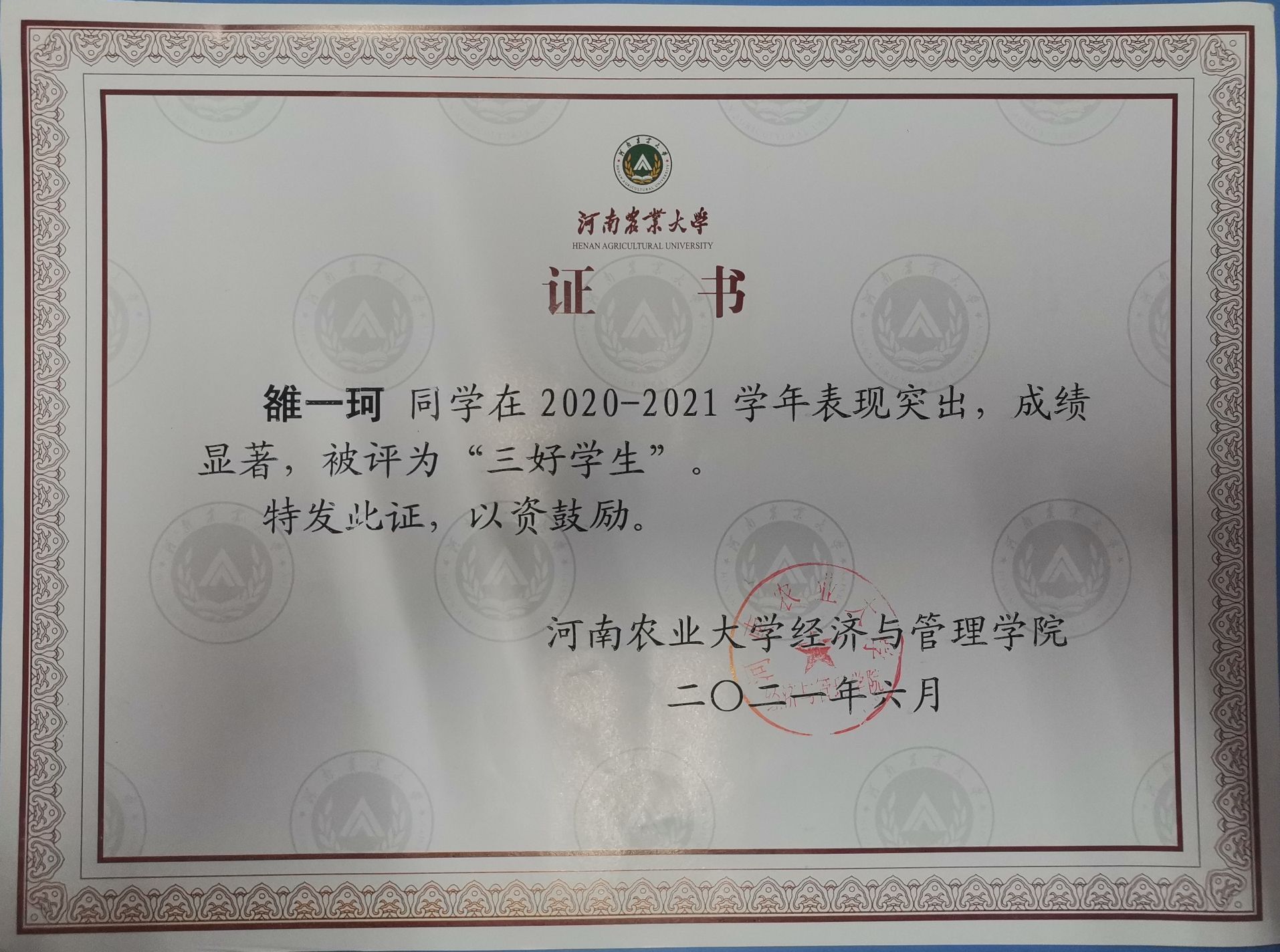 19级经济学专业3班学生,2021年国家奖学金获得者。大一学年综合成绩排名专业第三,大二学年综合成绩排名专业第一,曾获得国家励志奖学金,院宣传工作先进个人和院级三好学生等荣誉,顺利通过英语四六级。
