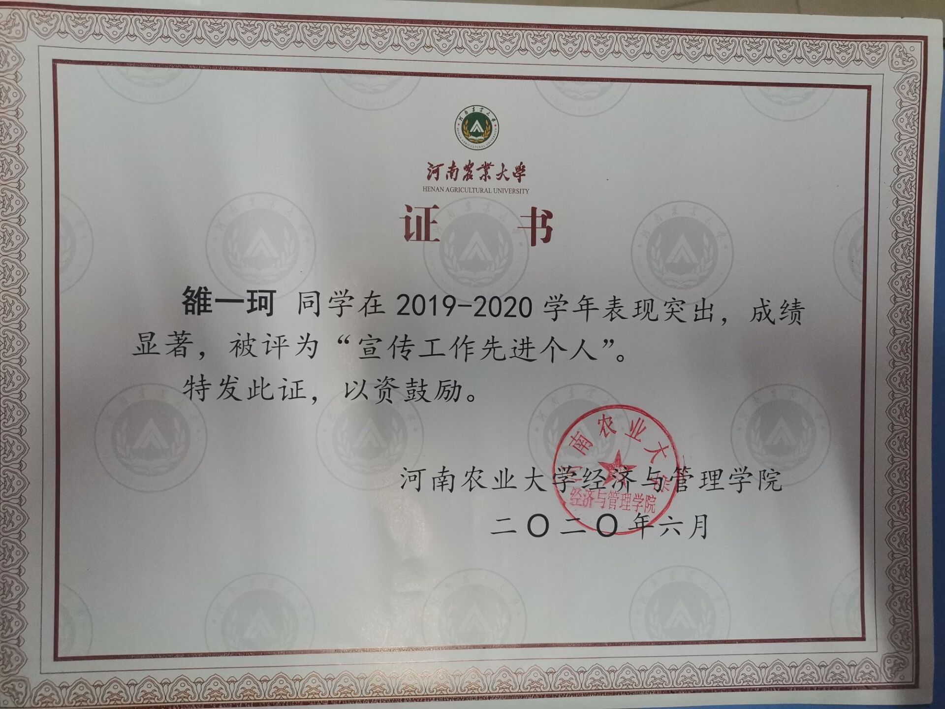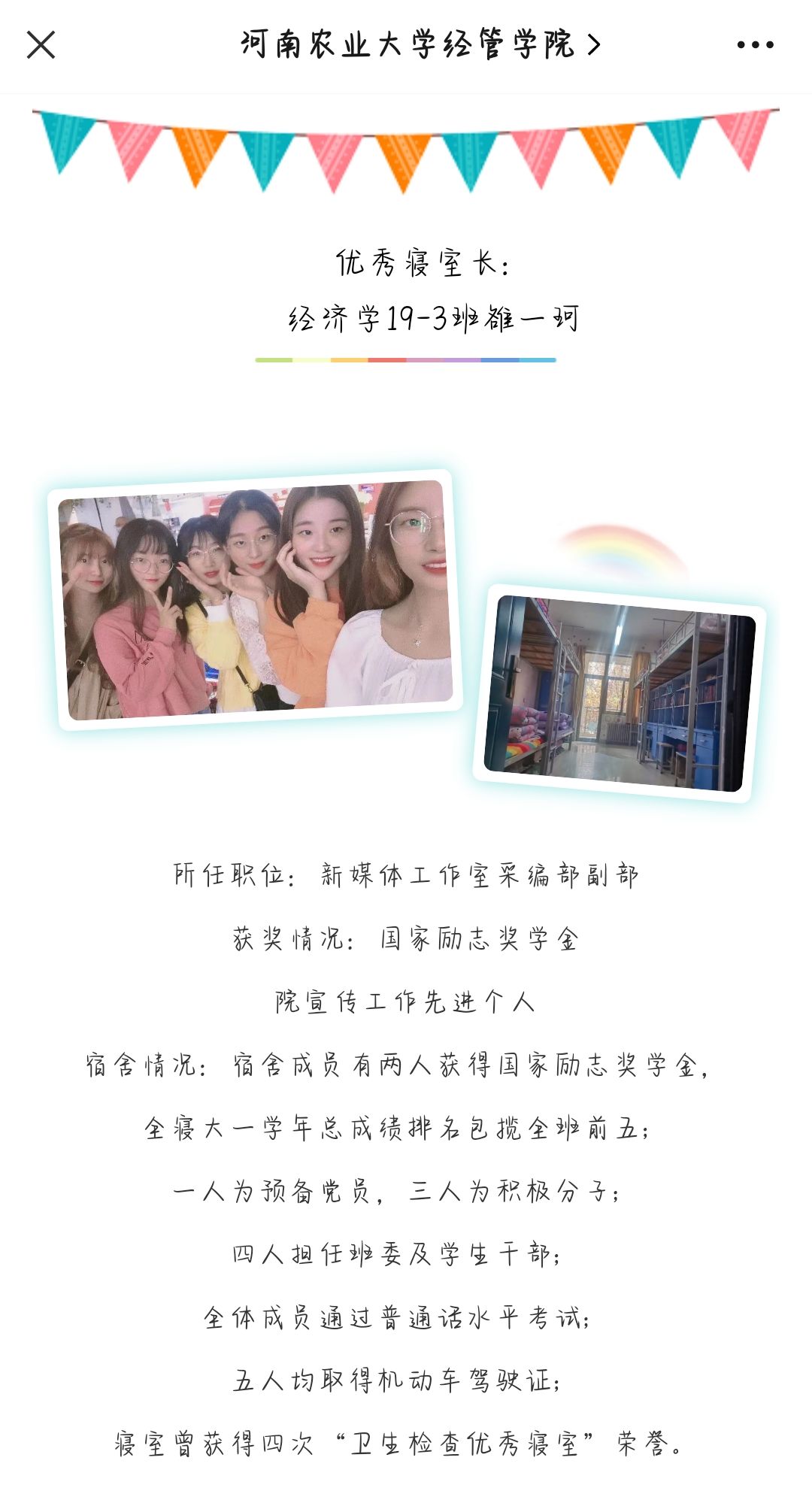 优秀寝室长评选中,她被评 为“优秀寝室长”,其所在寝室在河南农业大学经管学院公众号学风建设栏目推出。