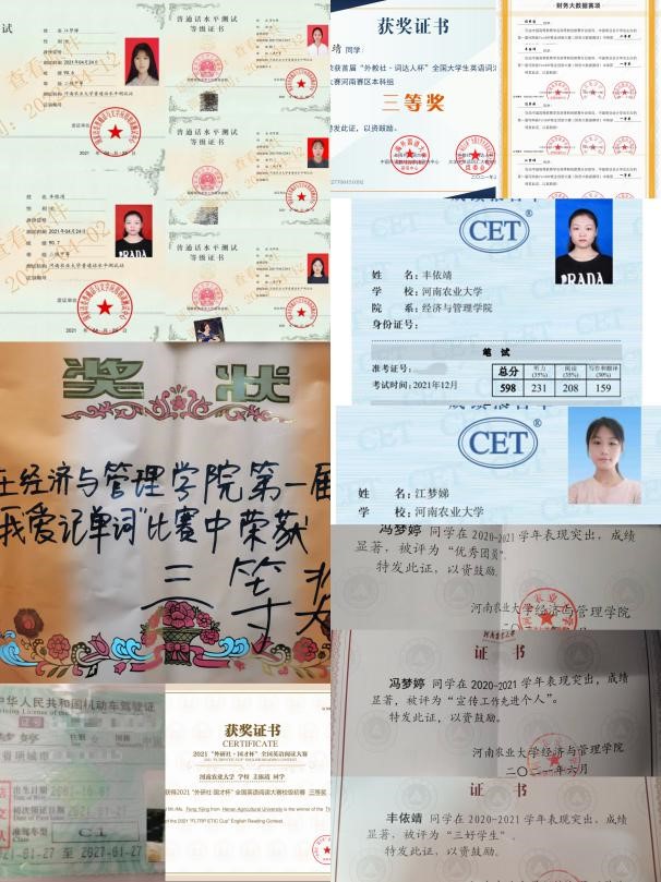 荣获一等。吴红艳:2021年 12月,参加全国高校创新英语挑战活动翻译赛优秀奖。李慧娴:获河南农业大学郑开马拉松优秀志愿者、河南农业大学优秀志愿者;荣获院级三好学生、国家励志奖学金;2021年10月,职业生涯规划作为话剧成员荣获优秀演员奖;2021年9月,参加“致.我的大一”演讲比赛荣获优秀奖;在家乡组织的“请党放心,抗疫有我”青年志愿服务中被评为“优秀志愿者”。杨佳亭:河南农业大学青年志愿者协会中被评为“优秀志愿者”;经济管理学院“绿色行·健康跑”活动中,被评为“跑步标兵”;获得河南农业大学铁军第三届正式队员证书;在校园军旅文化建设工作中被评为“先进个人。王阳:2021年12月,参加2021大学生可持续发展知识竞赛荣获初赛一等奖;2020年9月,参加“四史”学习教育竞答活动,成绩优秀。