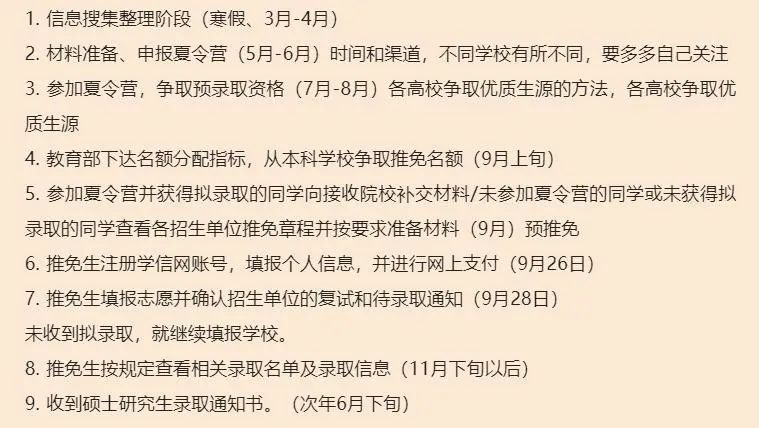 针对预推免阶段,首先,做好信息整理。在这个阶段,我们会面试很多学校,所以大家可以建一个Excel表格,写上自己所投递的学校、每个学校需要的材料、提交方式、截止日期、面试时间等,完成一个标记一个。其次,善于总结。从一次次面试中总结经验,从网上收集各种面试资料,询问学长学姐相关的面试经验并结合自身情况借鉴,给自己专业课的复习做规划,预演可能询问的问题以及问题延伸的方向,构建知识框架。最后,保持良好的心态。这段时间可能对于很多保研人来说自信心会被打击,激情也会被磨灭,但永远不要害怕被拒绝。