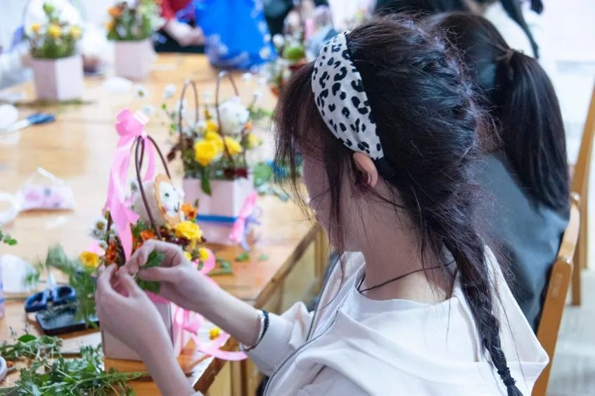 本次活动特邀请花艺师为大家讲解花卉知识,展示插花的技巧。花艺师首先讲解基本的花艺知识,并详细介绍常见花种、插花基本造型及技巧、色彩应用要点等知识,她用通俗易懂言语讲解大家如何选材和制作插花,介绍花卉的选择、颜色的搭配、花枝的修剪和造型的摆放等,并通过实际操作的方式传授盆钵插花的基本技艺,让大家感受插花艺术的独特魅力。紧接着花艺师的剪裁示范、插花表演令在座的同学们频频点头称赞。看到老师完成的精美作品后,大家更是兴致盎然、跃跃欲试。活动现场色彩绚丽花香四溢,在轻松愉快的氛围中,大家从取材、剪叶、构思开始,逐步完成了属于自己的作品,它们或是高低错落,或是俯仰呼应,或是疏密聚散。看着通过自己双手制作成的插花作品,大家的脸上都洋溢着喜悦的笑容。