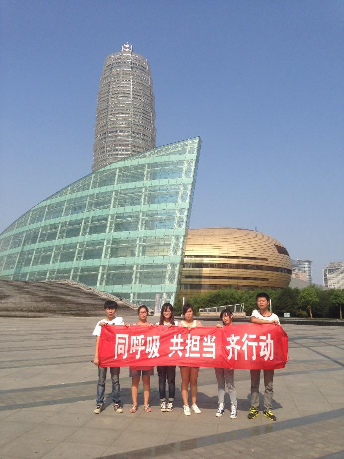 为积极响应“建功四个河南,点亮青春发展”,推进“美丽河南”建设,促进绿色、可持续发展,国贸13-1班实践小组于7月1、2日去往郑州CBD商务中心开展暑期社会实践活动。此次活动的主要内容是针对郑州市现下的雾霾天气状况,向本市市民大力宣传环境保护的重要性,倡议每位公民共同行动。