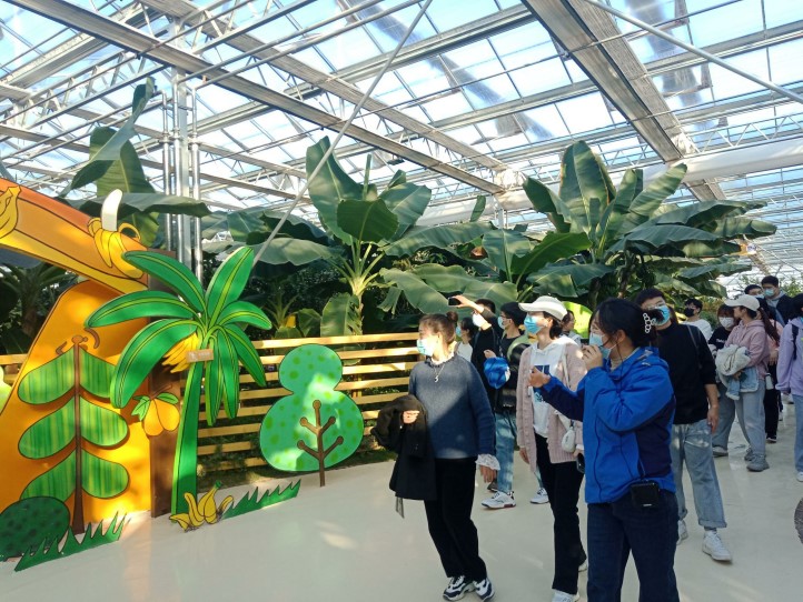 首先,同学们在讲解员的带领下由南门进入,参观了蔬汇高科馆,通过讲解员的介绍,同学们了解了蔬菜的生产、加工、流通等产业链环节,观赏了融合本地地名的产品,如杞县大蒜、杞县辣椒、八里湾番茄等,在新奇与感叹的同时,同学们也感受到了这里先进的科研创新成果。其次,同学们跟随讲解员的步伐移步到了汴州粮仓馆,同学们了解了关于粮食作物的种植以及相关的农业政策,深刻认识了乡村振兴中粮食供给的重要性。接着,讲解员又带领着同学们观赏了花开盛世馆的花卉,有同学们常见的,也有一些是听过名字但是未真正见过的奇异花卉,使得同学们尤为大开眼界,让同学们的认知不是停留在课本上,而是通过实践进一步开拓自己的视野,丰富自身的知识。该馆旨在推动以鲜切花卉、芳香花卉和食用花卉为主的产业发展,让同学们感受到了新的农业产业发展形式为农业的经济发展注入的新活力。然后,同学们在讲解员的解说下对扶正本草馆里中医药生产、加工、保健等内容有了初步的接触,并且讲解员为同学们普及了一些医药知识。随后,在果趣农乐馆里,同学们观赏了一些果树并了解了水果产业的三产融合发展,明白了乡村振兴战略的实施需要不断地为农业经济注入新的发展活力。同学们跟随讲解员参观的最后一个馆是汴都水韵馆,在这里,同学们不仅见识了智能节水灌溉技术和循环高效水产养殖模式,而且了解了水产养殖的各个产业链环节。