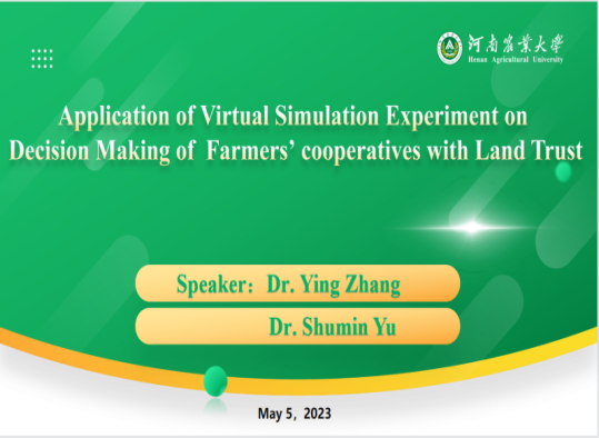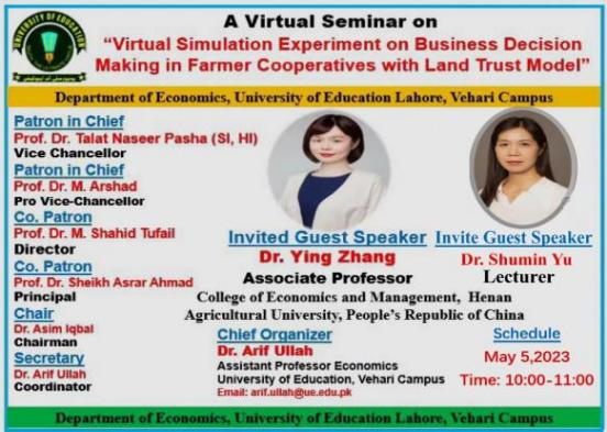 会议由拉合尔教育大学Arif Ullah博士主持,拉合尔教育大学Arif Ullah教授致辞。青年教师张颖博士做了题为“Application of Virtual Simulation Experiment on Decision Making of Farmers cooperatives with Land Trust”(土地托管类农民合作社经营决策虚拟仿真实验的应用)的主旨演讲,从实验设计、实验应用等几个方面介绍了该项目的建设情况,并在线进行了演示。该虚拟仿真实验是德州扑克单机 教师主持的河南省高等教育教学改革研究与实践项目“农经专业核心课“理案讨虚实”五位一体教学模式研究与实践”(2021SJGLX094)以及河南省虚拟仿真实验重点项目的建设成果。