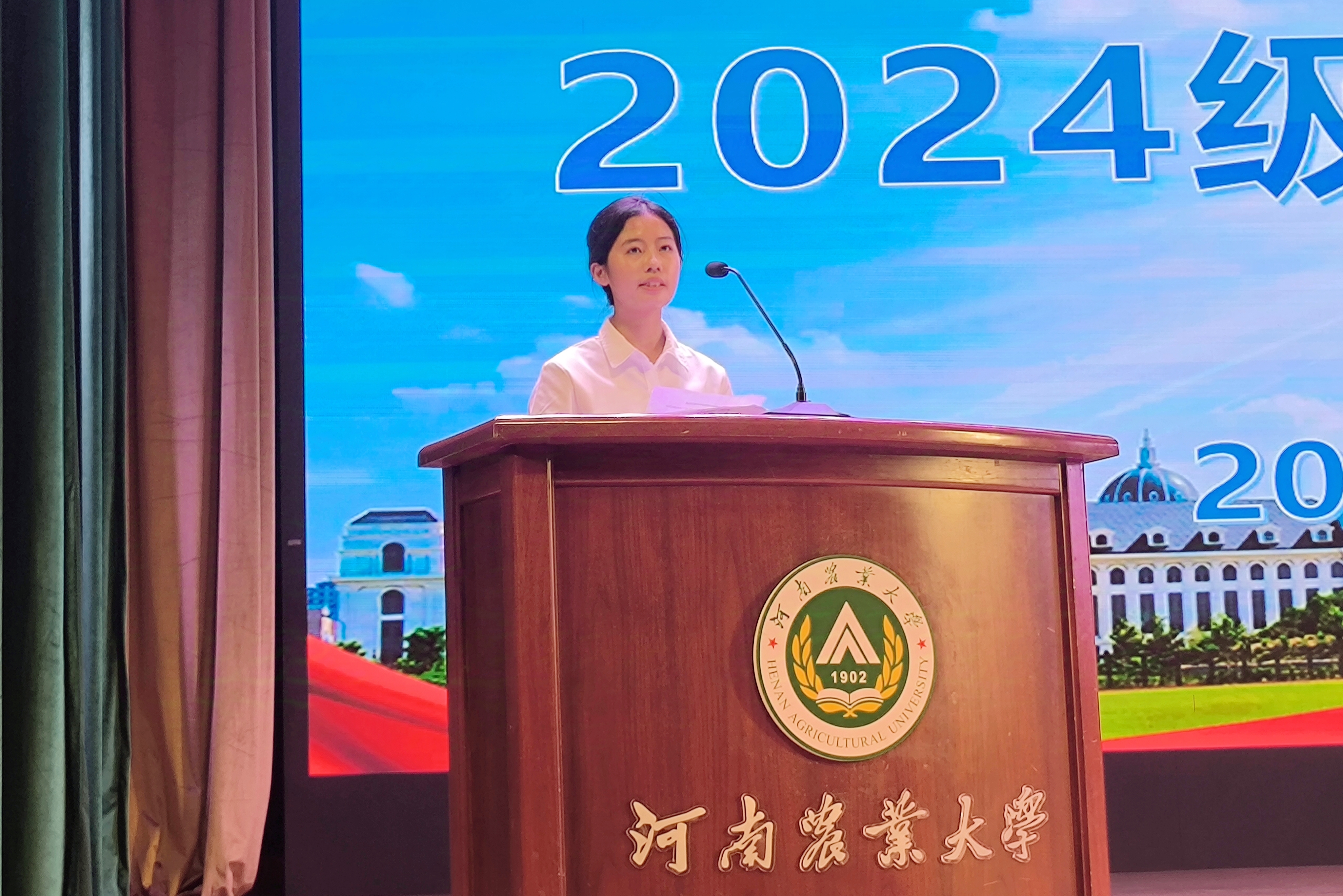新生代表经济学24-1班赵静仪发言。她向所有关心帮助新生的领导老师、学长学姐表示了衷心的感谢。并从十年寒窗谈及青年志向,生于强国、躬逢盛世,希望同学们心存志气,向阳而生,勤奋学习,用有为之行动回报盛世之中国。