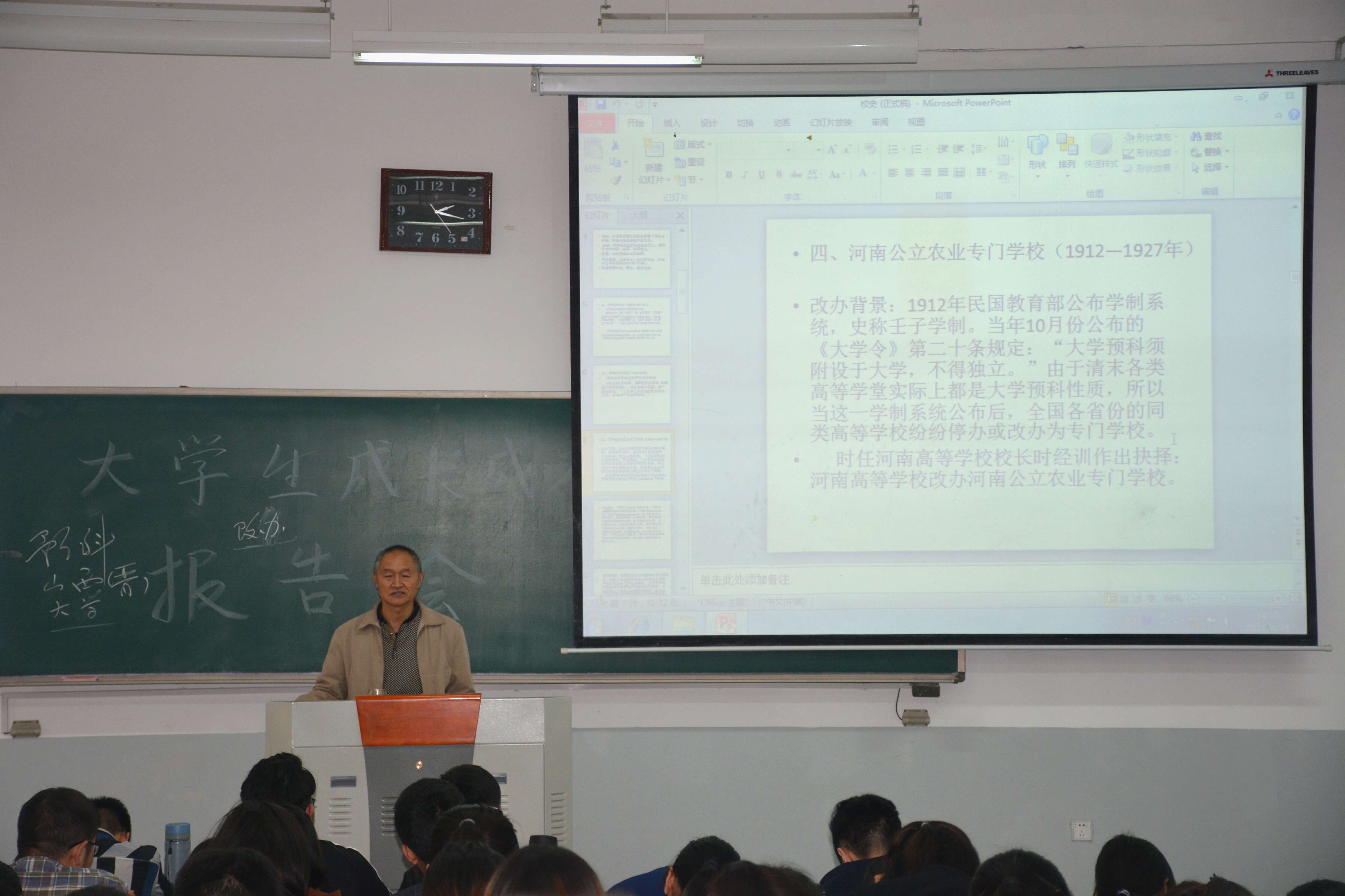首先,王金铎老师对吴海峰馆长进行了简单的介绍,并宣布此次报告会正式开始。接着,吴海峰馆长列出河南农业大学校史的五个时期,分别为前身期、河南公立农业专门学校时期、河南大学农学院时期、河南农学院时期和河南农业大学时期。随后,他对每个时期都进行了详细的介绍,讲述了每个时期的背景、校址、发展历程和科目设置,并向在场同学介绍了我校的历任校长和书记、学科建设和学校成就。同时,吴海峰馆长还对我校的办学理念、学校精神、校训、校徽等做出阐明。现场学生认真听讲,气氛活跃热烈。最后,吴海峰馆长祝愿经管学院学生能够在伟大中国梦的背景下不忘初心,牢记使命,创造出属于自己的辉煌。此次报告会在同学们热烈的掌声中圆满结束。