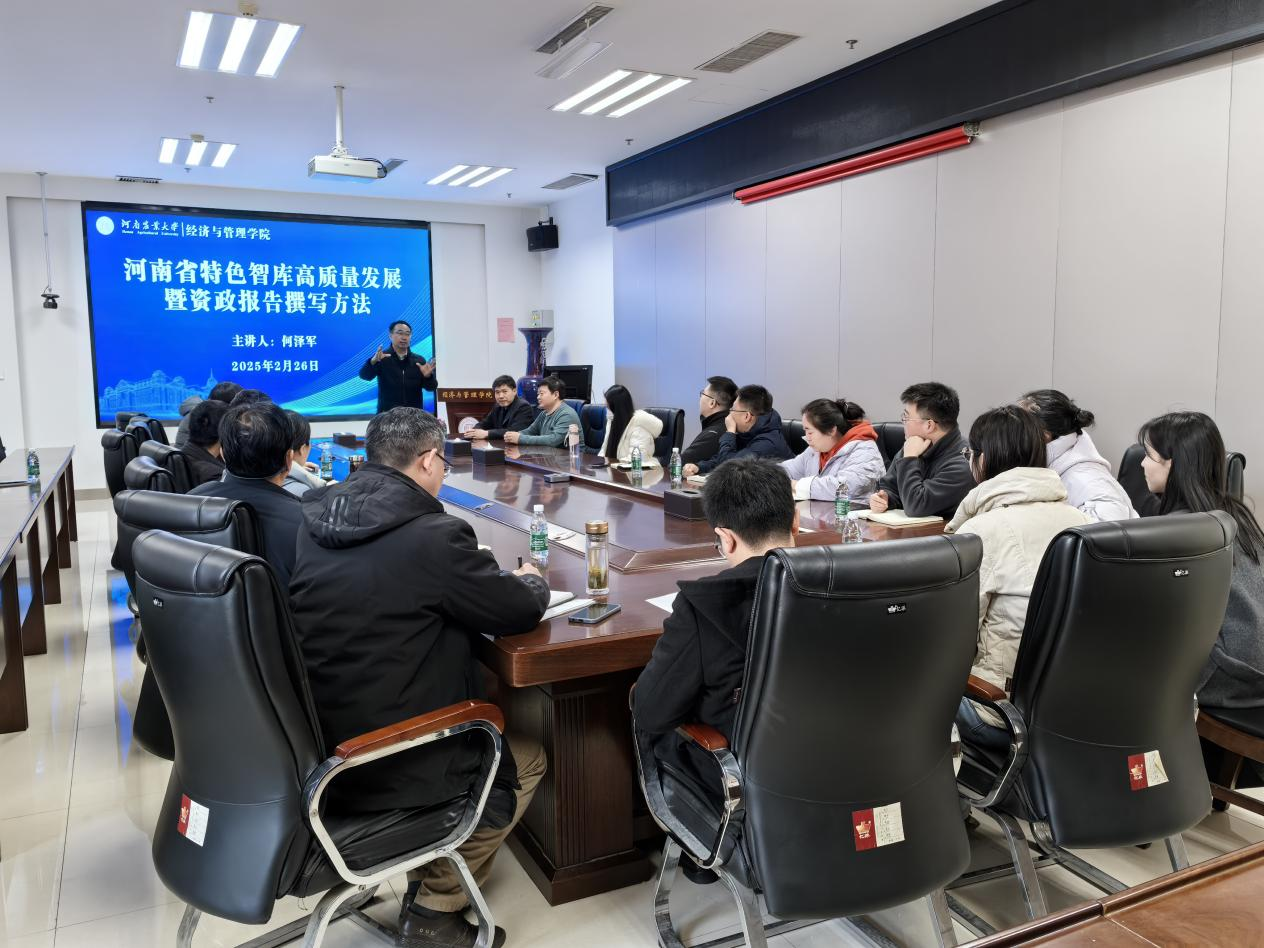 2025年2月26日上午,由河南省农村经济发展软科学研究基地主办的“特色智库高质量发展与咨询报告撰写”专题讲座在繁塔楼A215学术报告厅举行。我校社科处副处长何泽军教授担任主讲人,副院长刘瑞峰、河南省农村经济发展软科学研究基地全体成员及德州扑克单机