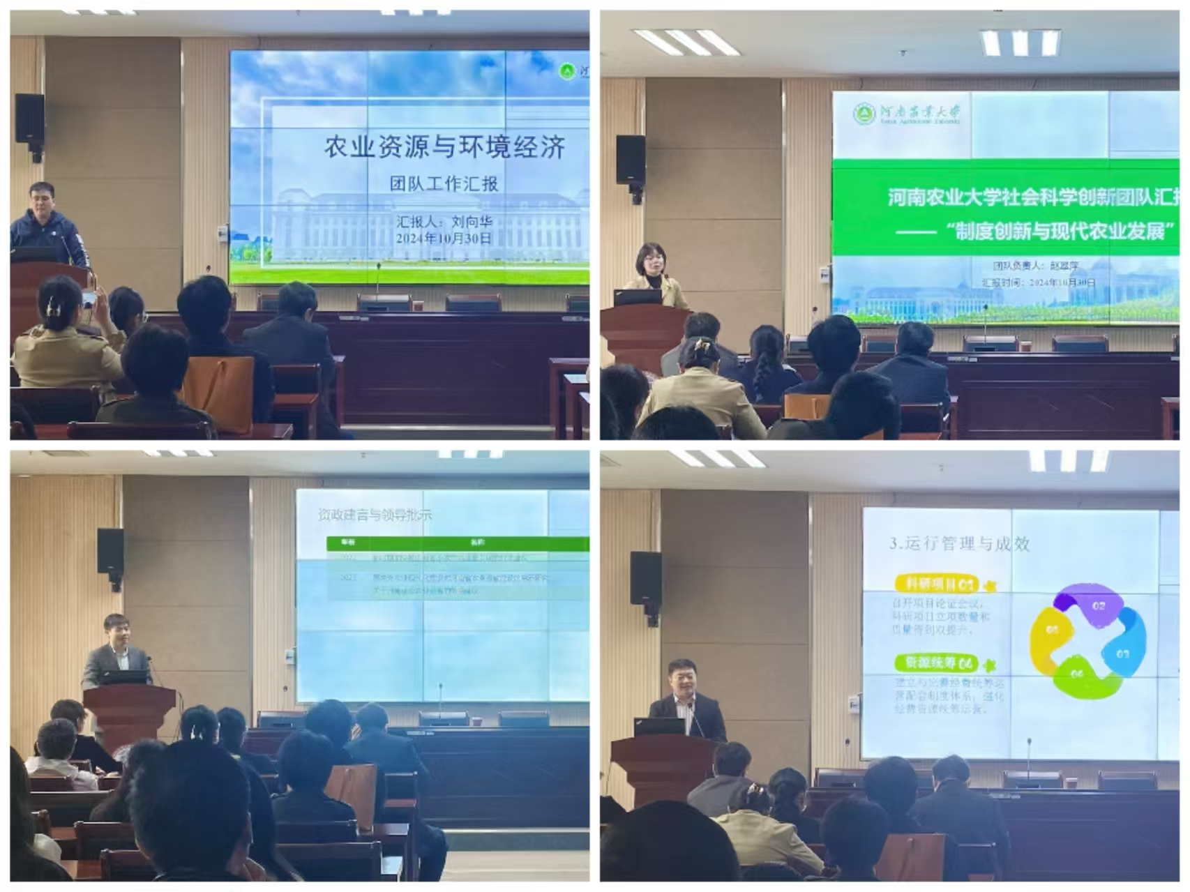 农业资源与环境经济、制度创新与现代农业发展、畜牧经济管理与乡村振兴、乡村振兴与农业高质量发展四个创新团队汇报人分别详细介绍团队基本情况、团队运行与成效、团队业绩以及未来的工作规划。每个团队都展示了其在科研领域的深厚积累和丰硕成果,分享了团队合作的宝贵经验和创新思路。