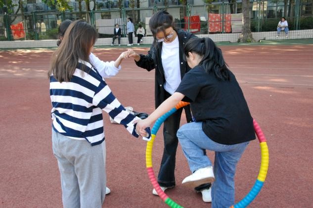 手牵手,心连心,团结协作,一圈到底,每个队伍都争分夺秒传递着呼啦圈,低头,弯腰,抬腿,大家想尽一切办法,让呼啦圈迅速穿过身体。赛场周围围满了前来观赛加油的同学,他们欢呼着、呐喊着,将现场的气氛推向了高潮。