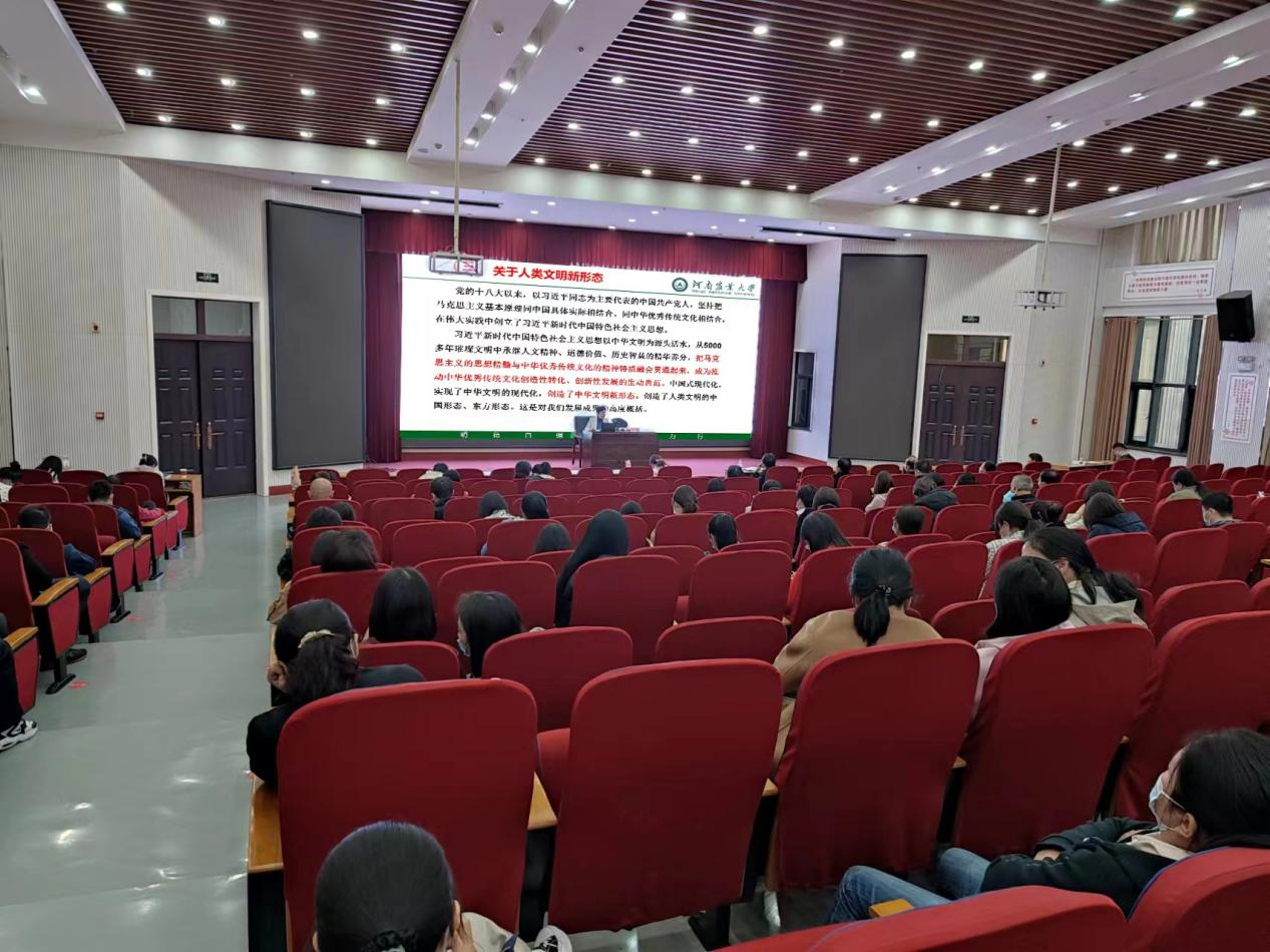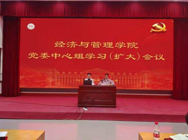 召开党委理论中心组学习(扩大)会议,特邀马克思主义学院教授陈娱讲授马克思主义中国化时代化的最新成果,学习《习近平谈治国理政》第四卷。学院全体教职工参加学习。会议由党委副书记方芳主持。