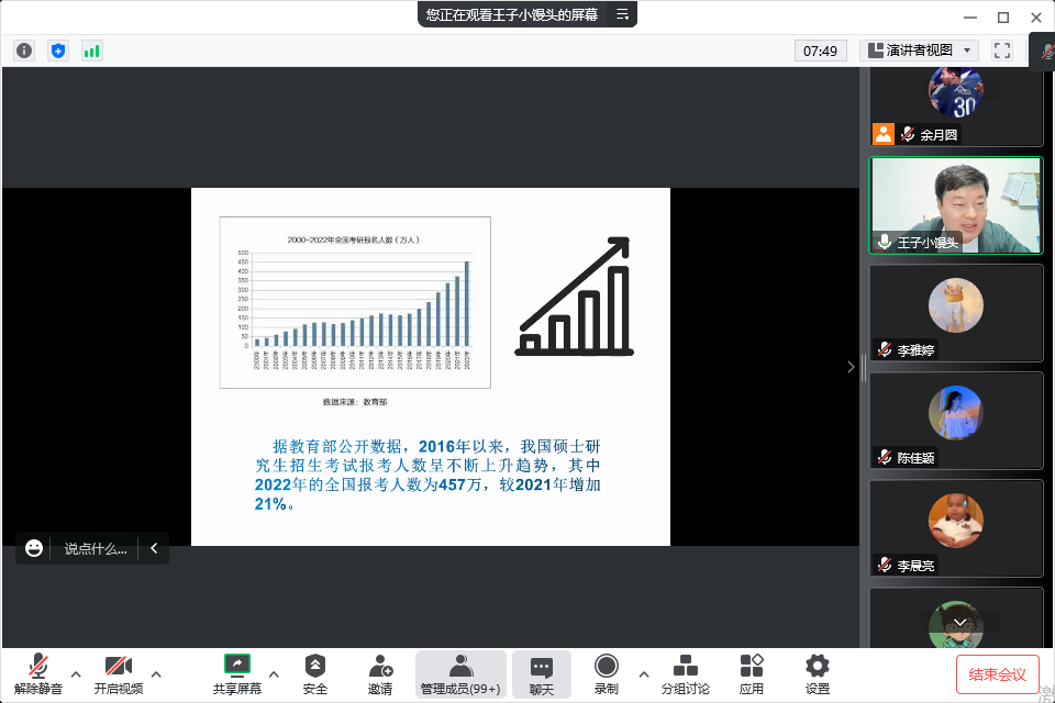 的师资情况及近年来的招生情况,详细说明了本院研究生也是不错的选择。在提问环节,同学们积极参与,从专业选择、就业方向、心态调整等方面提出自己疑问,而刘院长也通过大量的实例深入浅出地为同学们答疑解惑。