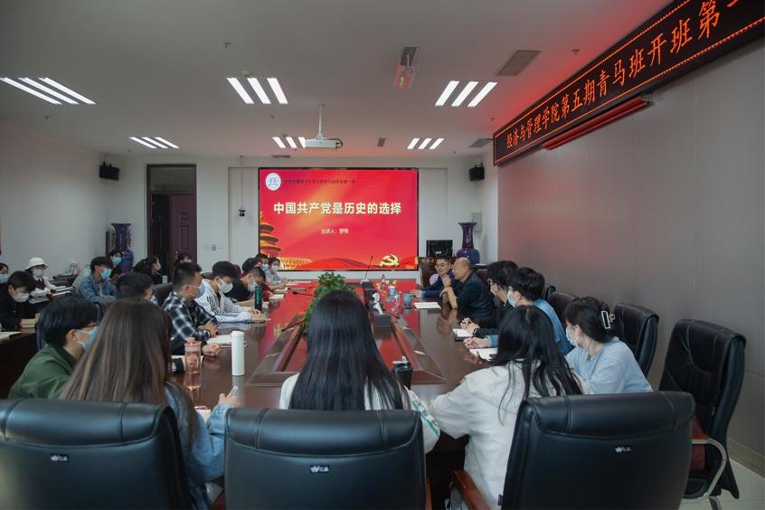 于教学楼A215召开第五期以“中国共产党是历史的选择”为主题,青马班开班第一课。院正处级组织员罗伟,院团委书记杨鑫出席此次会议,30名青马班学员积极参加。