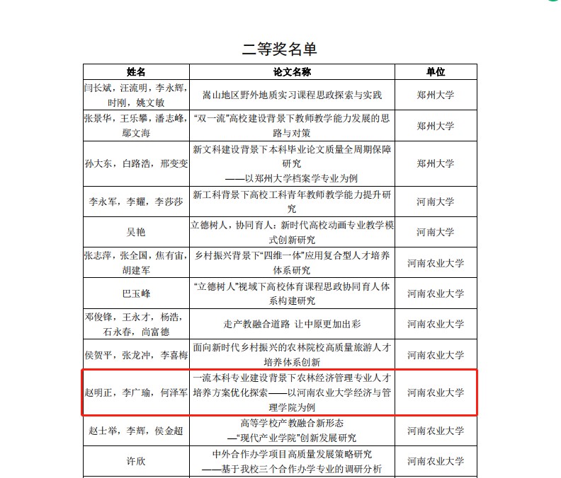 赵明正等老师撰写的《一流本科专业建设背景下农林经济管理专业人才培养方案优化探索——以德州扑克单机-德州扑克下载 为例》,对比分析了德州扑克单机 围绕一流本科专业建设,于2018年实施的人才培养方案调整前后两版农林经济管理专业人才培养方案的异同,总结了一流本科专业建设的人才培养目标和标准,提出了未来人才培养方案调整的方向。该文获得征文活动二等奖。