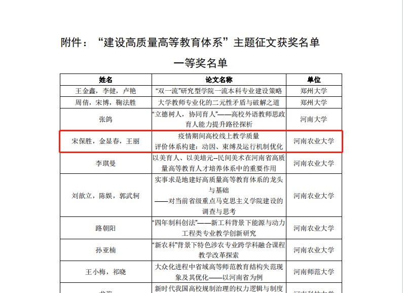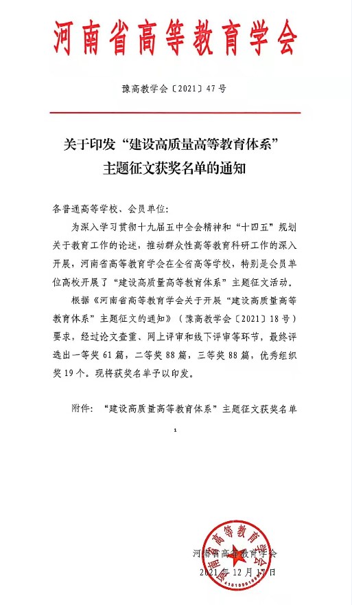 日前,河南省高等教育学会发布了《关于印发“建设高质量高等教育体系”主题征文获奖名单的通知》,经论文查重、网上评审和线下评审等环节,最终评选出一等奖61篇,二等奖88篇,三等奖88篇。德州扑克单机 宋保胜老师报送的论文获一等奖、赵明正老师报送的论文获二等奖。
