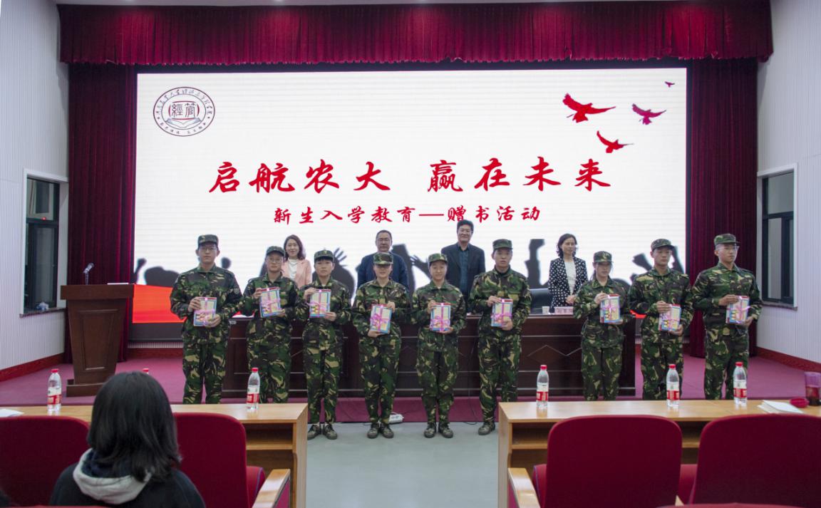 (学院领导向新生班级代表赠送书籍)