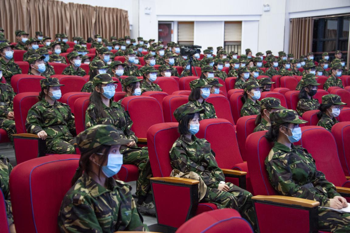 见面会开始前,20级新生身着迷彩服有序入场。结合疫情常态化防控要求,各新生佩戴好口罩、保持合理间距。伴随着雄伟的国歌声,此次新生见面会拉开了帷幕。