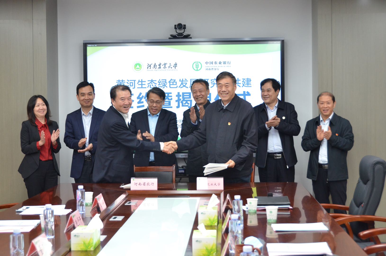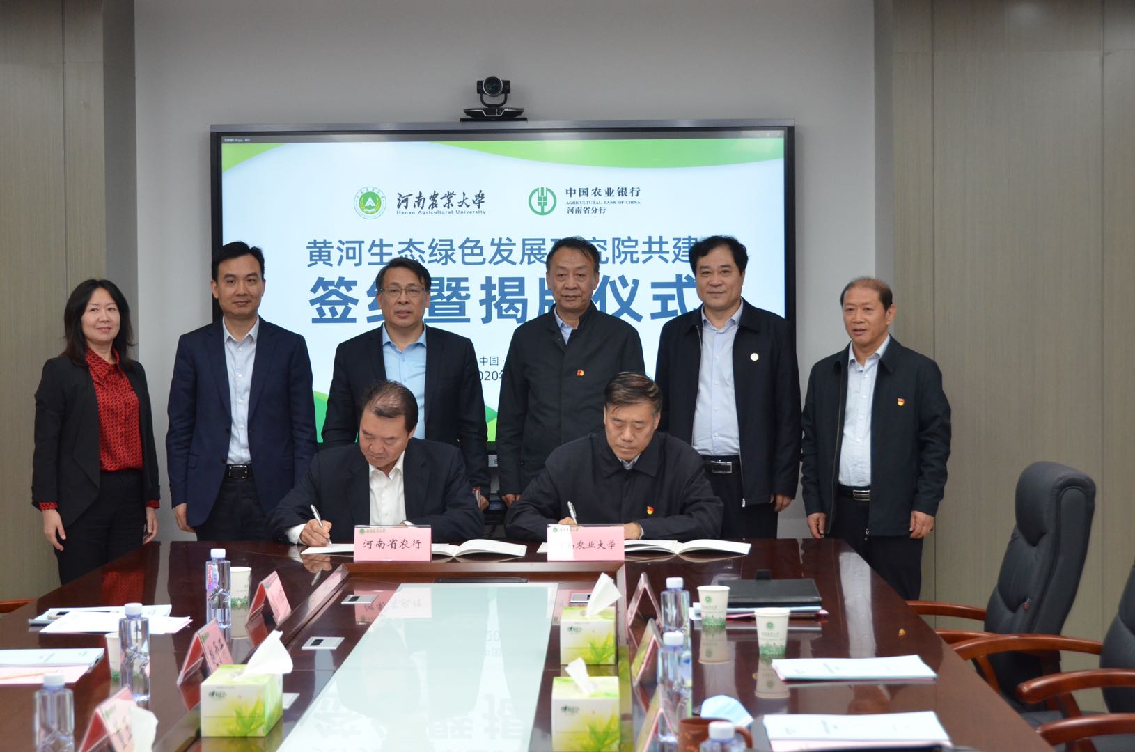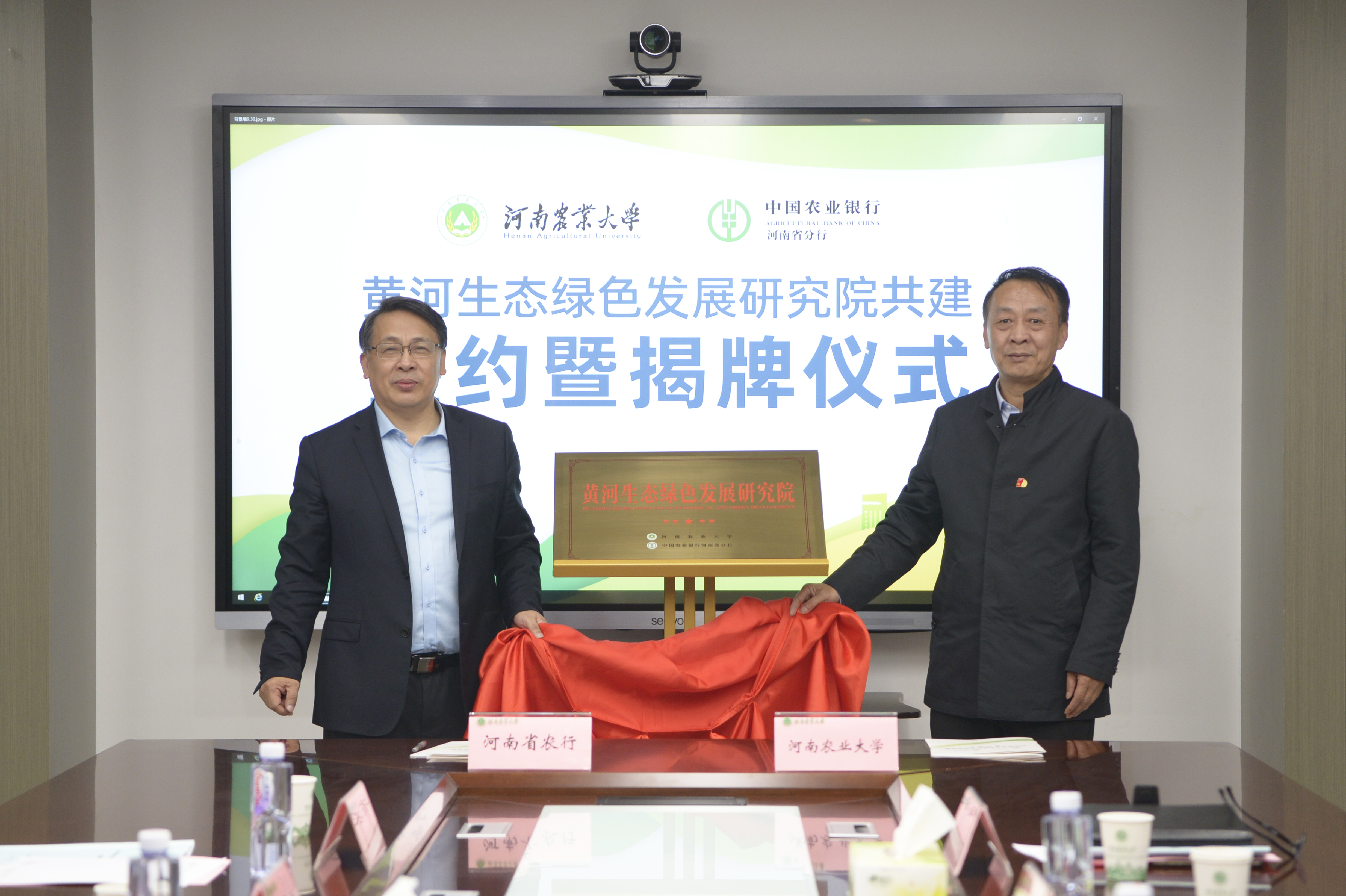 (通讯员:吴一平)10月21日下午,我校与中国农业银行河南省分行签约共建黄河生态绿色发展研究院,中国农业银行河南省分行党委书记、行长董玉华和校党委书记魏蒙关共同为黄河生态绿色发展研究院揭牌。中国农业银行河南省分行副行长赵予开、梁本录,我校校长、中国工程院院士张改平,校党委副书记、副校长介晓磊,副校长康相涛出席签约暨揭牌仪式。校办主任郑东方、校社会服务处处长贺德先、院党委书记牛青扬、院长马恒运和吴一平、唐华仓教授等列席仪式。