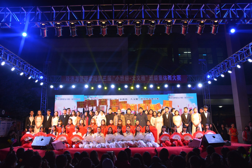 第三届“小班级•大文雅”班级集体舞大赛以“文化经管,点亮青春”为主题。经过初赛的激烈比拼与精心选拔,共有16支比赛队伍脱颖而出,进入决赛。在活力十足的开场舞《Try everything》中,本次集体舞大赛正式拉开帷幕。伴着欢快的旋律,参赛选手们将动感十足的现代舞和轻盈柔美的古典舞完美结合,迅速点燃现场观众的热情。各班参赛队伍纷纷使出浑身解数,尽情舞动,用精彩的舞蹈让同学们感受到了异域的风情、青春的朝气以及文化的厚重。绚丽的灯光、欢快的节奏,为现场观众呈现了一场视觉与听觉的华美盛宴。在场同学纷纷被火热气氛所感染,欢呼声、呐喊声此起彼伏。院艺术团富有创意的串场节目更是精彩纷呈,激情活力的歌曲演唱,悠扬婉转的器乐演奏,将现场气氛再度推向高潮。16级全体助班精心准备的助班秀让在场观众眼前一亮,引得全场喝彩。最后,经过公开、公平、公正评选,农经15-1班荣获一等奖,营销16-2班、财管15-4班、国贸16-1班荣获二等奖,财管15-3班、工商15-1班、国贸15-1班、经济学15-3班、国贸16-2班荣获三等奖,营销15-2班、经济学16-1班、农经16-1班、农经16-2班、工商15-2班、财管16-1班、经济学16-5班荣获优秀奖。