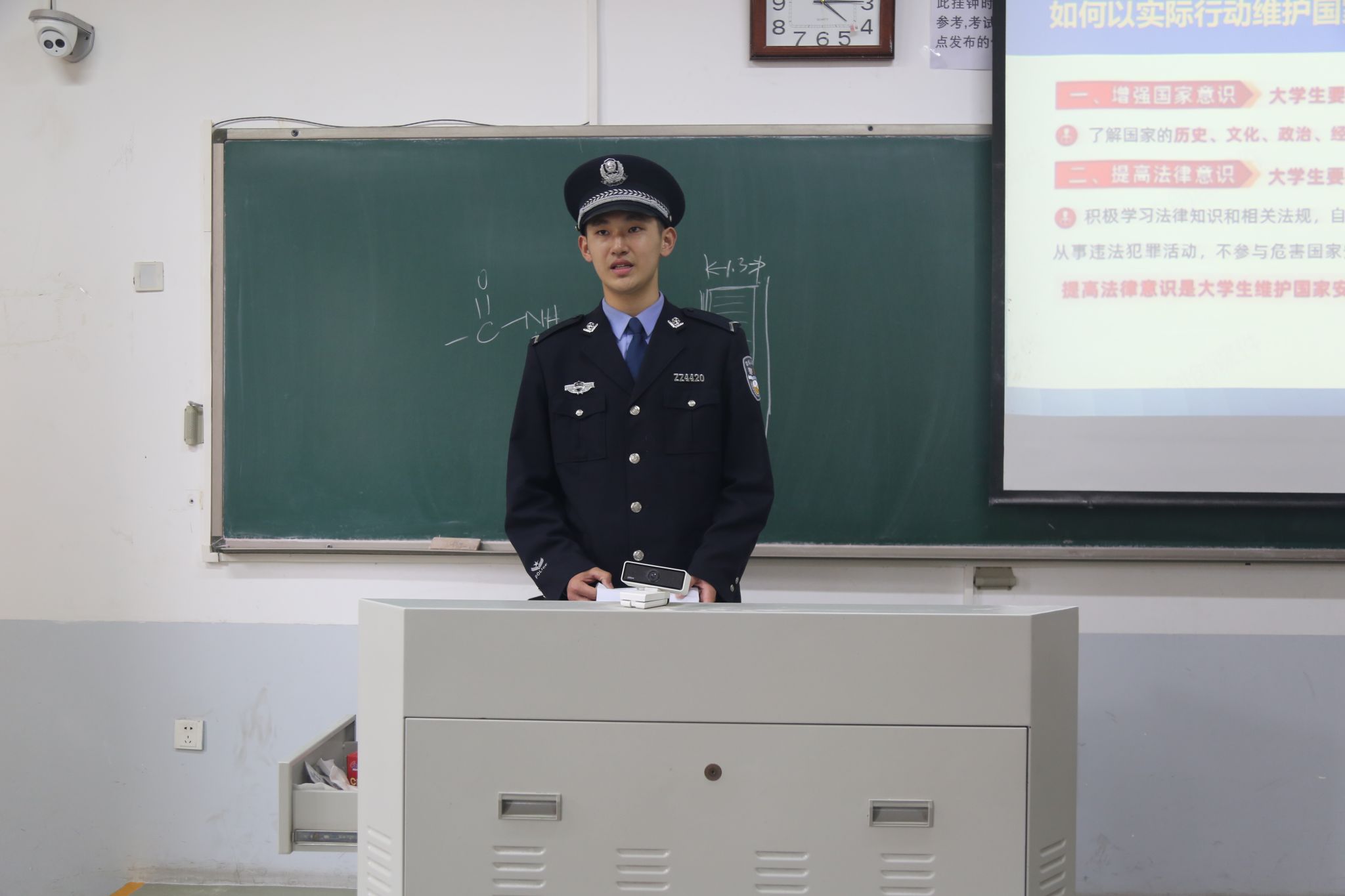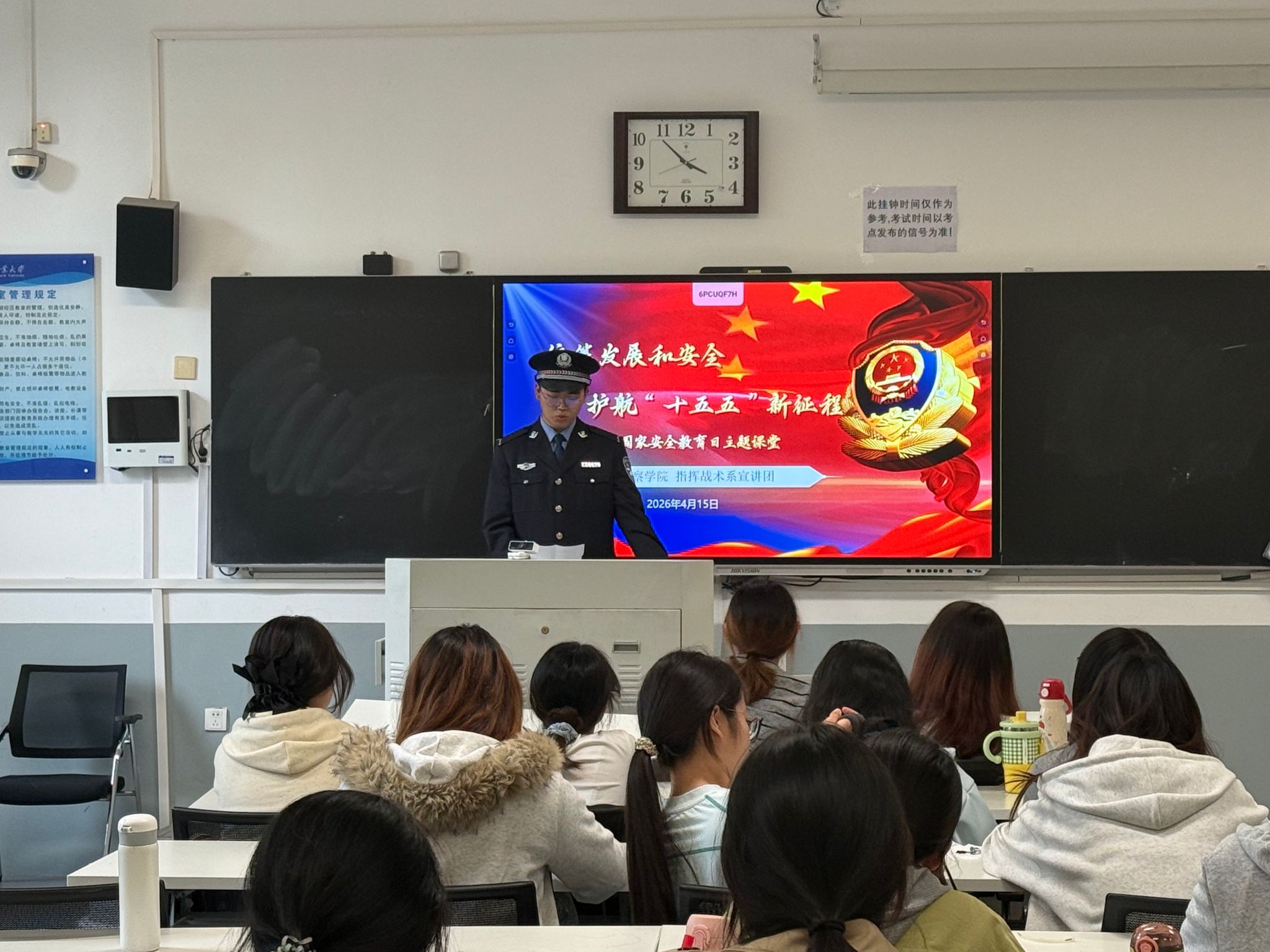 活动当天下午,河南警察学院20名优秀学警组成宣讲小组,以“敲门进班”的创新形式,走进河南农业大学班级,利用课间15分钟开展国家安全知识微宣讲。学警们着装规范、列队入校,安静有序进入教学楼,以庄重敬礼开启宣讲,围绕总体国家安全观、网络安全、反间谍、校园安全防范等核心内容深入浅出讲解,并通过互动问答与同学们交流,让国家安全知识在轻松氛围中入脑入心。